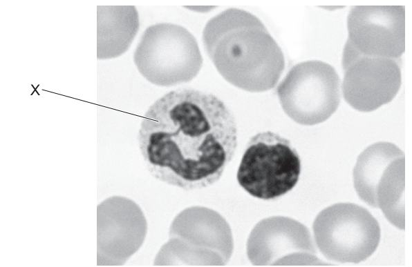 Lymphocytes (A) are smaller with a large round nucleus, platelets (C) are tiny cell fragments, and red blood cells (D) are biconcave and lack a nucleus. Thus, the correct answer is B (Phagocyte).