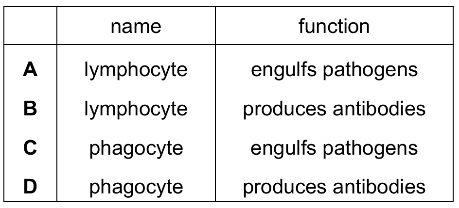 The diagram depicts a phagocyte (B), a type of white blood cell that engulfs and digests pathogens. Its irregular shape and lobed nucleus are key identifying features.