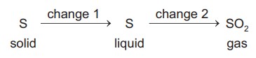 The change from liquid sulfur to sulfur dioxide gas (SO2) is a chemical change. During this process, the chemical composition of the substance changes as sulfur undergoes a chemical reaction to form sulfur dioxide.
