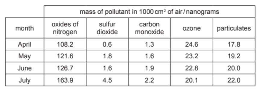 The table shows the mass of air pollutants, in nanograms, in $1000 \mathrm{~cm}^3$ samples of air taken over a four-month period.