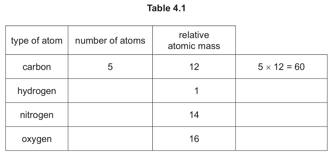 Complete Table 4.1 to calculate the relative molecular mass of \( C_5H_{11}NO_3 \).