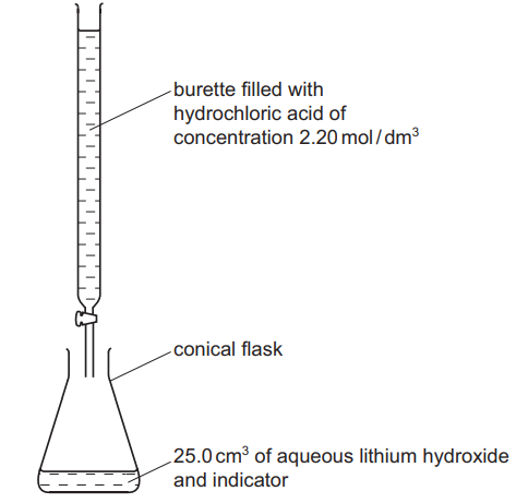 25.0 cm³ of aqueous lithium hydroxide is pipetted into the conical flask. A few drops of an indicator are added. Dilute hydrochloric acid is added slowly to the alkali until the indicator just changes colour. The volume of acid needed to neutralize the lithium hydroxide is noted.