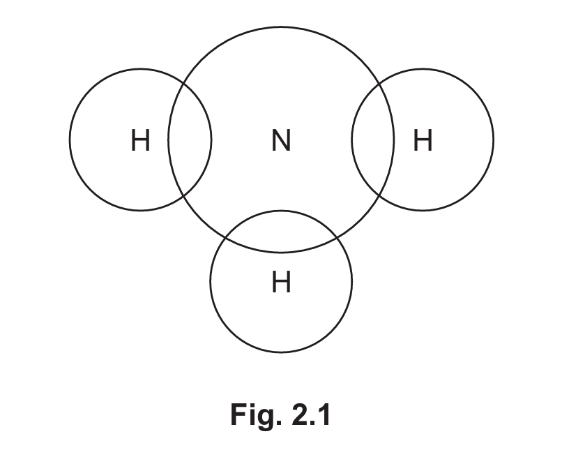 (b) Ammonia has a simple molecular structure. Complete Fig. 2.1 to show the dot-and-cross diagram for a molecule of ammonia. Show outer shell electrons only.