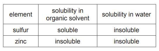 (iii) The table shows the solubility of sulfur and zinc in an organic solvent and in water. The organic solvent boils at 46°C.