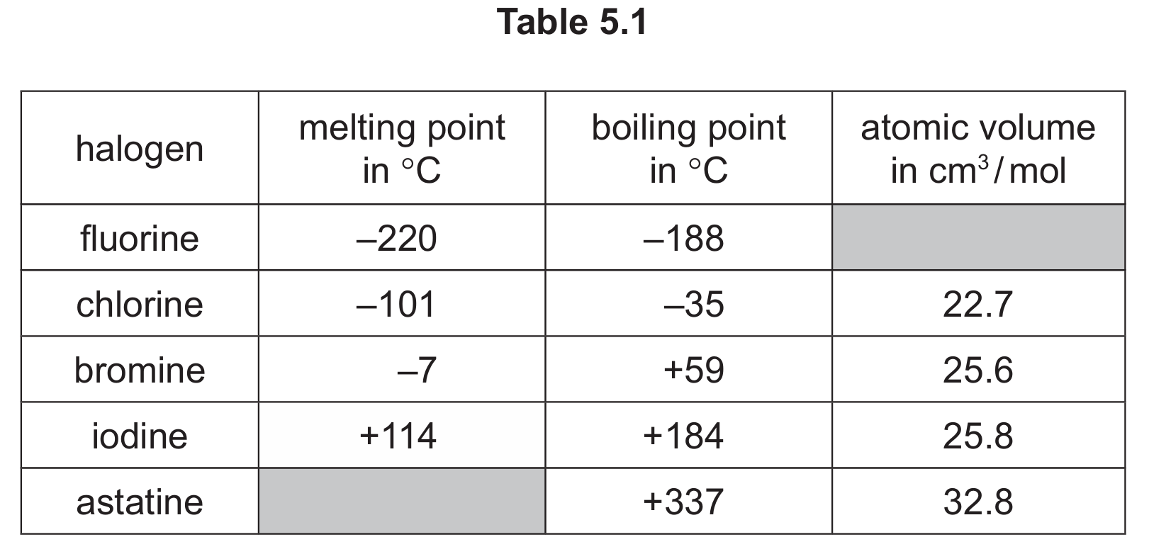 (a)(iii) Solid (1), because −240°C is below fluorine’s melting point of −220°C (1)
