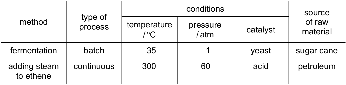 The table shows two methods used to make ethanol.