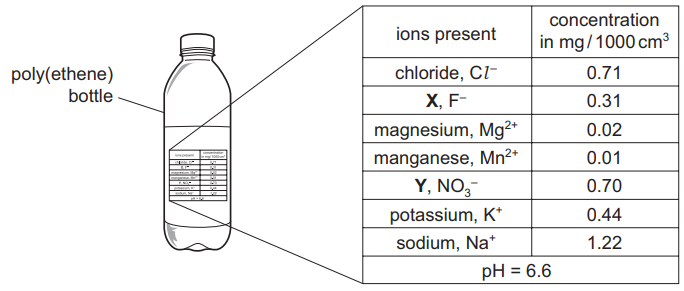The diagram shows a bottle of mineral water. The concentration of the ions present in the water is shown on the label. The pH of the water is also shown.