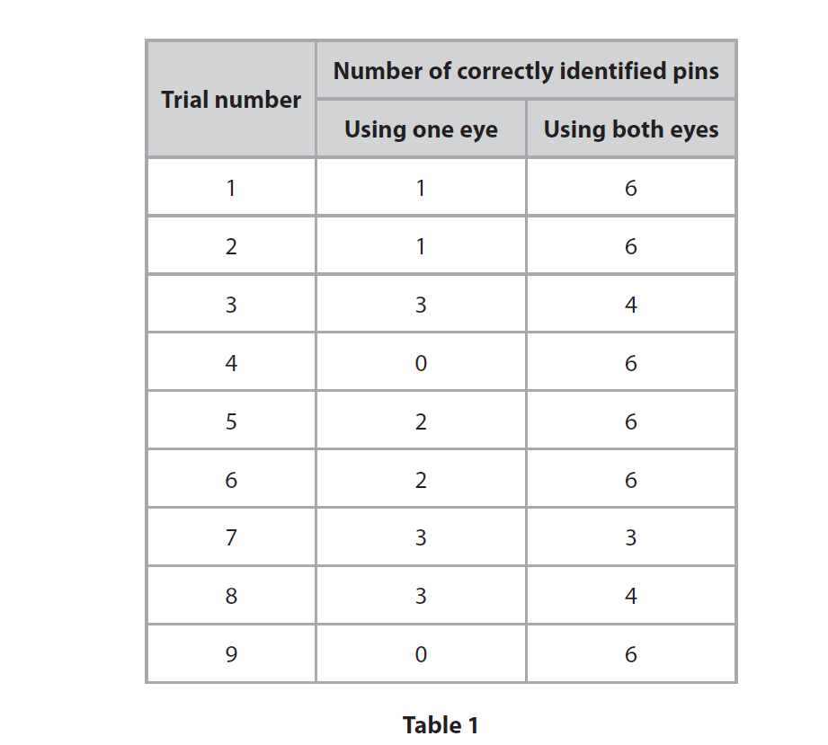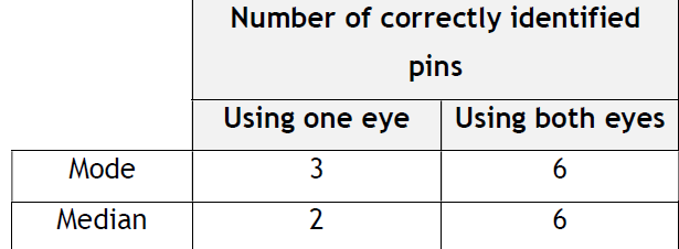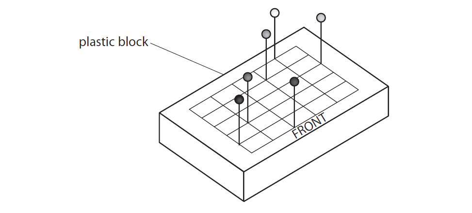 (b) A student investigates if using one eye or using two eyes is better for judging the distance of objects. The student uses the plastic block shown in the diagram. The block has a grid where six different coloured pins can be placed as shown in the diagram.
