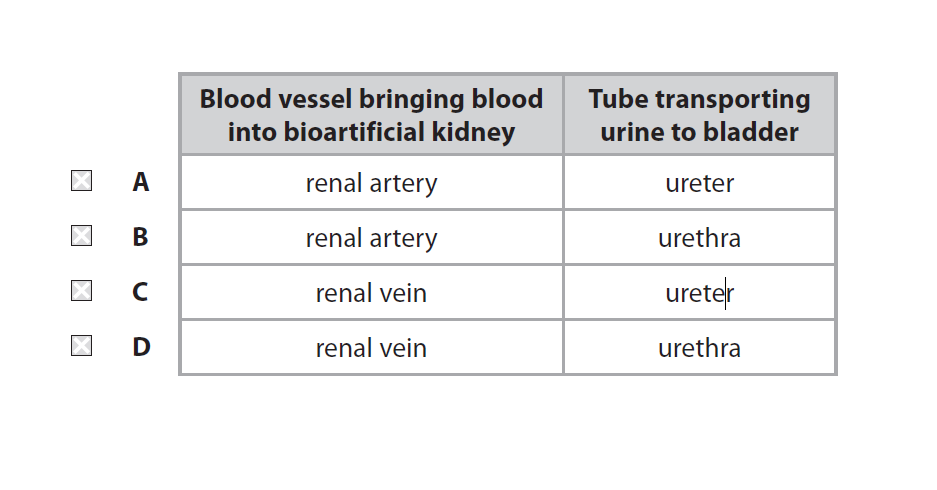 (iii) The bioartificial kidney is connected to blood vessels and to the tube that transports urine to the bladder in the same way as the human kidney. Which row of the table is correct?
