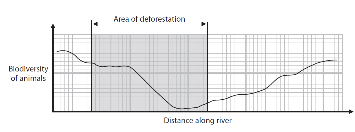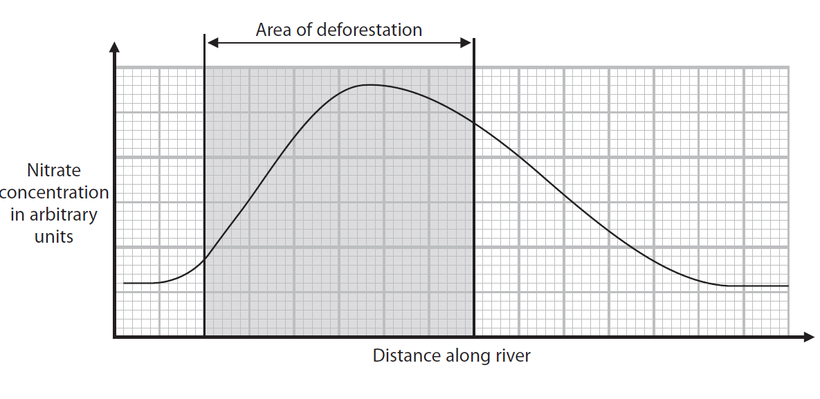 (b) Scientists investigated the effect of deforestation on a river. The river flows through a forest, part of which has been deforested.