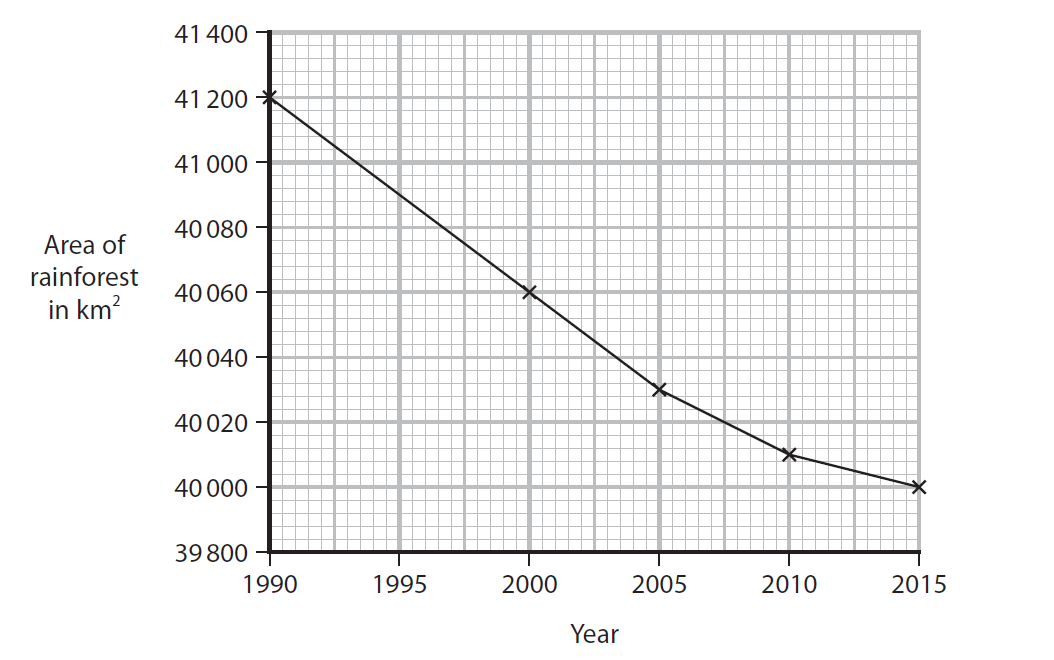 5 (a) The graph shows the change in area of rainforest on the Earth from 1990 to 2015.