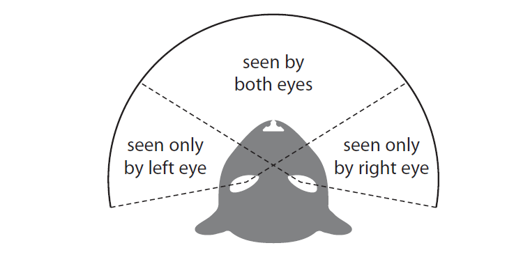 • large area seen by both eyes / large overlapping visual field / eq (1)
