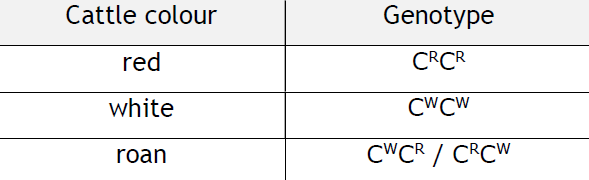 Hair colour in cattle is controlled by one gene with two alleles. The allele for white hair, CW, is codominant with the allele for red hair, CR.
