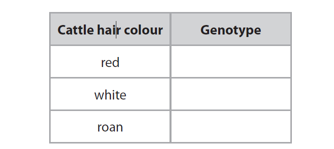 (b) (i) Complete the table by giving the genotypes of red cattle, white cattle, and roan cattle.