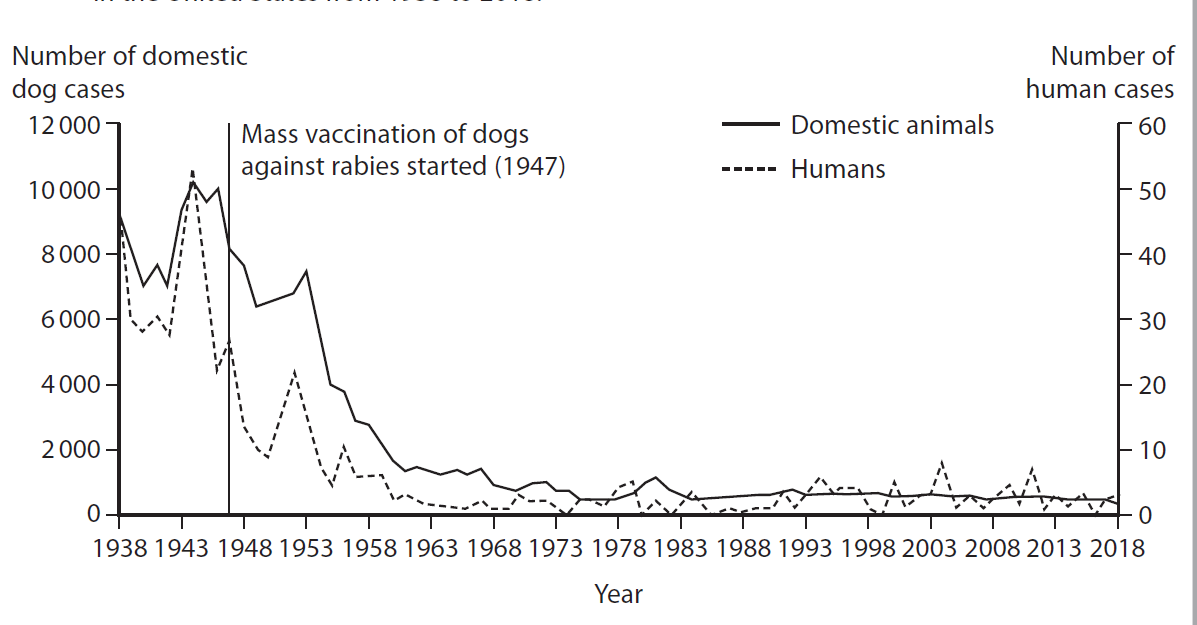 In the 1940s, a rabies vaccine for animals was introduced in the United States and most domestic dogs were vaccinated. The graph shows the number of cases of human rabies and domestic dog rabies in the United States from 1938 to 2018.