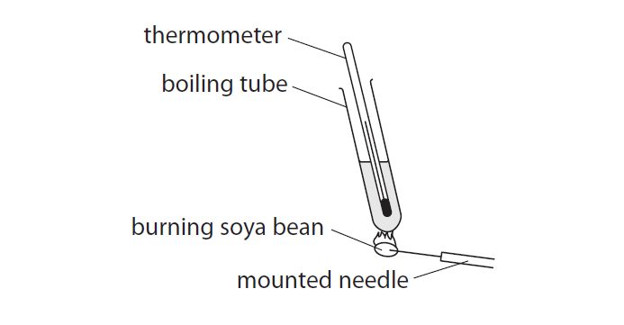 . ignite bean / set fire, and hold under test tube / water / heat water / eq (1)