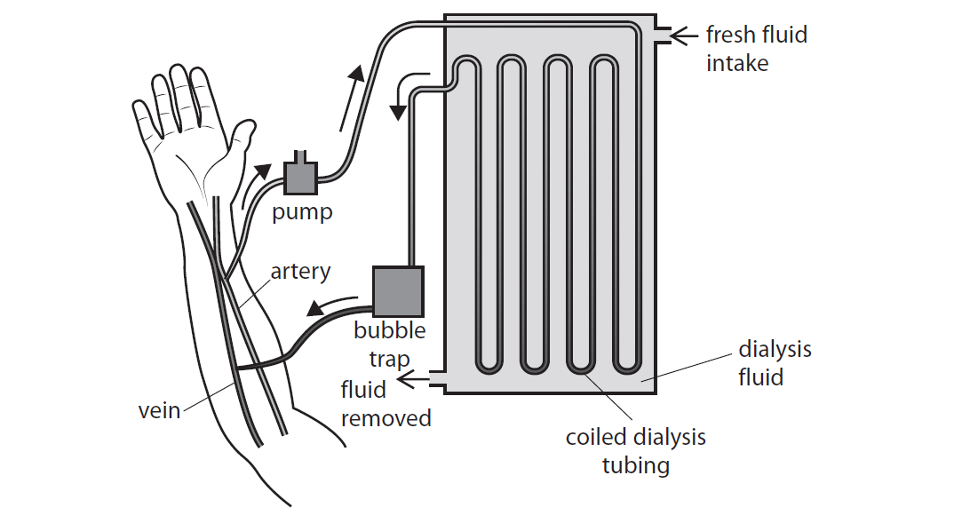 Chronic kidney disease affects approximately 12% of the world’s population and many people are unable to obtain treatment. One method of treating chronic kidney disease is by dialysis. The diagram shows how kidney dialysis is done.