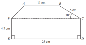 with AB = 11cm, angle BCF = 30°, and other given measurements. Calculate the area of ABCDEF.