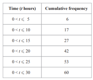 The cumulative frequency table gives information about the time, in hours, that each of 60 workers spent working from home in one week.