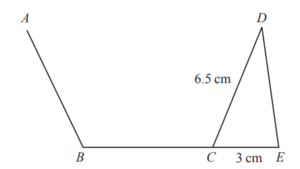 AB, BC and CD are three sides of a regular pentagon and CDE is a triangle. BCE is a straight line. CD = 6.5 cm, CE = 3 cm. Work out the area of triangle CDE (to 3 significant figures).