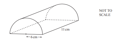 The diagram shows a half-cylinder of radius 6 cm and length 11 cm. Calculate the volume of the half-cylinder.