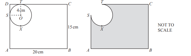 (i) \(ABCD\) is a rectangle with \(AB = 20 \, \text{cm}\) and \(BC = 15 \, \text{cm}\). \(S, X,\) and \(T\) are points on a circle center \(O\), such that \(DSA\) and \(DTC\) are tangents to the circle. The radius of the circle is 4 cm, and \(TX\) is a diameter of the circle. The shape \(DSXT\) is removed from the corner of the rectangle, leaving the shaded shape shown in the second diagram. Calculate the area of the shaded shape.