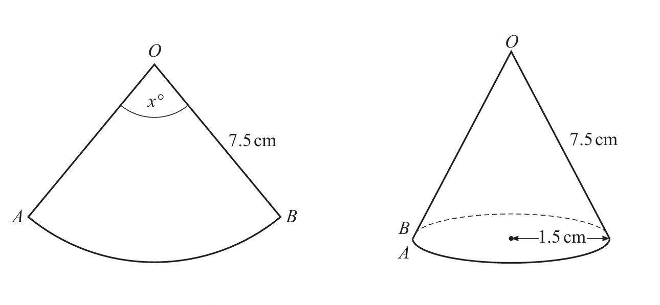 The arc length of the sector equals the circumference of the cone’s base. Using \( \frac{x}{360} \times 2\pi \times 7.5 = 2\pi \times 1.5 \), we solve for \( x \).