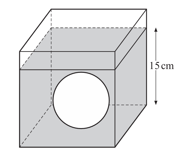 The cube contains water to a depth of 15 cm.