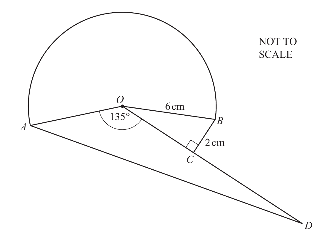 (a)(iii) 16.1 cm. First find OC using Pythagoras: √(6² – 2²) ≈ 5.66 cm, so OD = 11.32 cm. Then use cosine rule in triangle AOD: AD² = 6² + 11.32² – 2×6×11.32×cos(135°) ≈ 259, so AD ≈ √259 ≈ 16.1 cm.