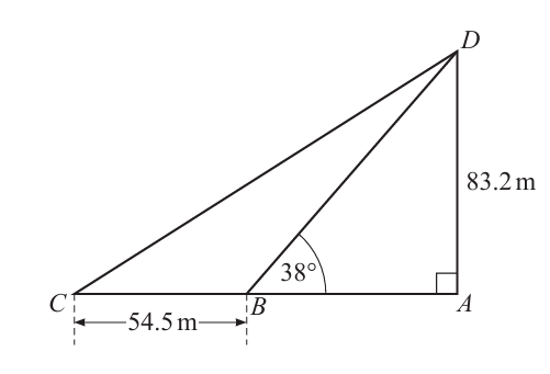 First find AB using tan(38°) = AD/AB, giving AB ≈ 106.5m. Then AC = AB + BC ≈ 161m.