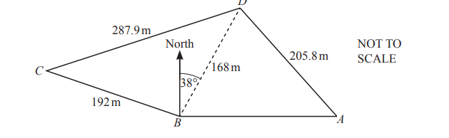 BC = 192m, CD = 287.9m, BD = 168m and AD = 205.8m.