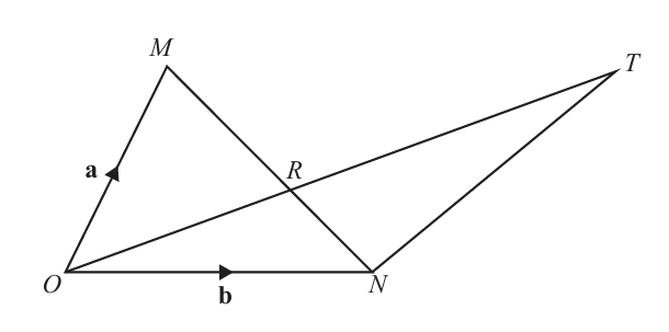 Since MR:RN = 3:2, R divides MN in ratio 3:2. Using section formula: \(\overrightarrow{OR} = \frac{2}{5}\mathbf{a} + \frac{3}{5}\mathbf{b}\).