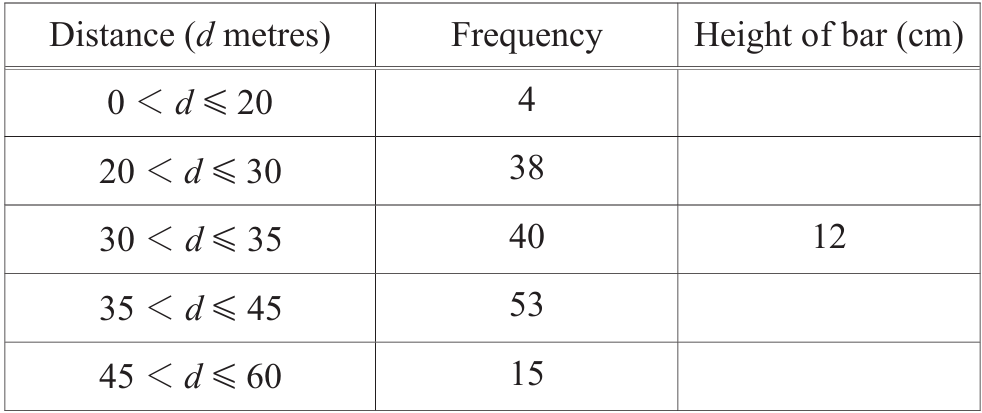 Frequency density = frequency ÷ class width. For 30-35m: 40÷5 = 8 units/cm. Scaling factor = 12÷8 = 1.5. Other heights: frequency density × 1.5.