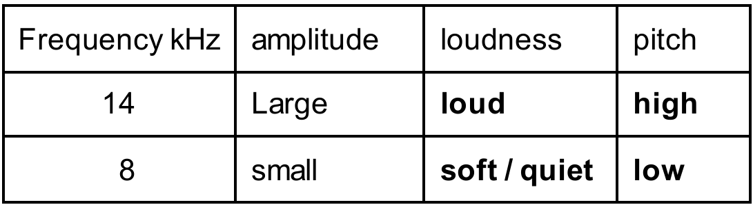 Detailed solution: In sound waves, amplitude directly dictates the volume or loudness of the sound; a larger amplitude displaces particles further, resulting in a loud sound, whereas a small amplitude yields a soft or quiet sound. Frequency determines the pitch of the sound. Therefore, the higher frequency of $14\text{ kHz}$ correlates to a higher pitch, while the comparatively lower frequency of $8\text{ kHz}$ produces a lower pitch.