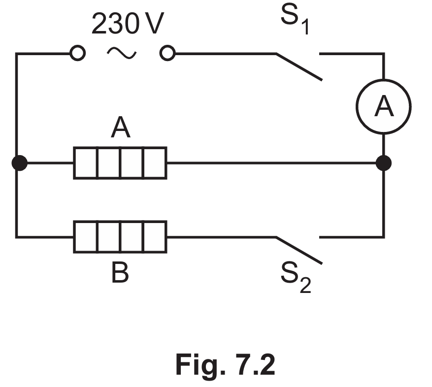 Detailed solution: Heaters A and B are identical and connected in parallel, meaning they both experience the same potential difference of $230\text{ V}$. Since the heaters are identical, heater B will also draw a current of $3.9\text{ A}$ when its switch $S_2$ is closed. According to Kirchhoff’s Current Law ($I_{total} = I_1 + I_2$), the total current measured by the ammeter is the sum of the currents in each branch: $3.9\text{ A} + 3.9\text{ A} = 7.8\text{ A}$.