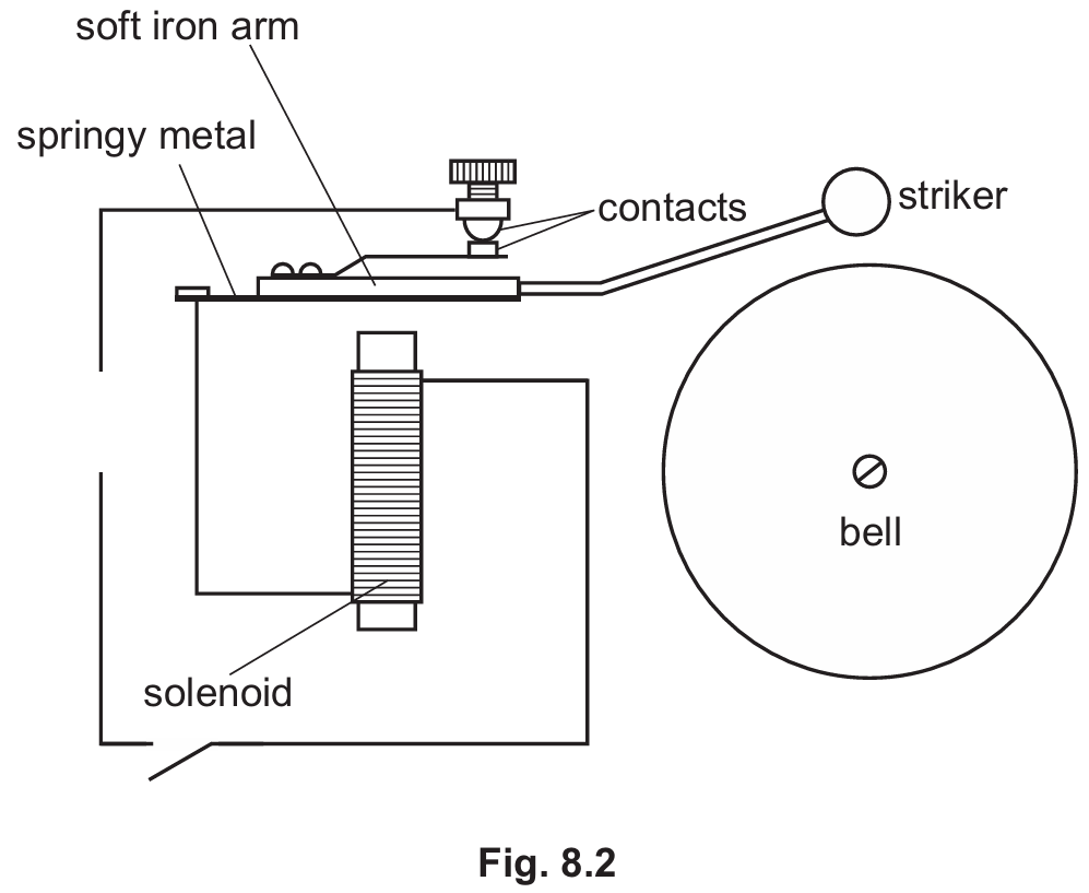 Closing the switch allows current to flow, creating a magnetic field in the solenoid. This electromagnet attracts the soft iron arm, pulling it to strike the bell.