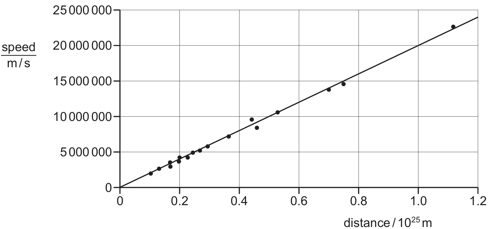 Selecting a point on the best-fit line, such as $d = 1.0 \times 10^{25} \text{ m}$ and $v = 20,000,000 \text{ m/s} = 2.0 \times 10^7 \text{ m/s}$.