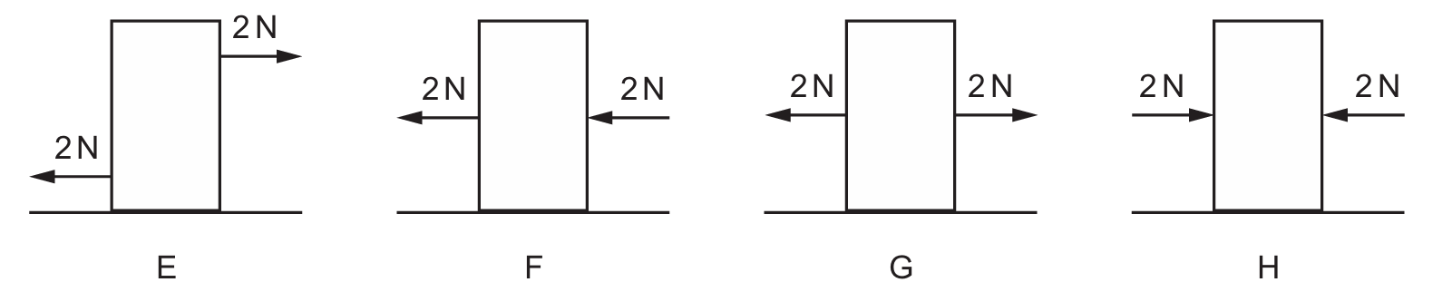 In diagrams G and H, the two $2~N$ forces act in opposite directions along the same line of action.