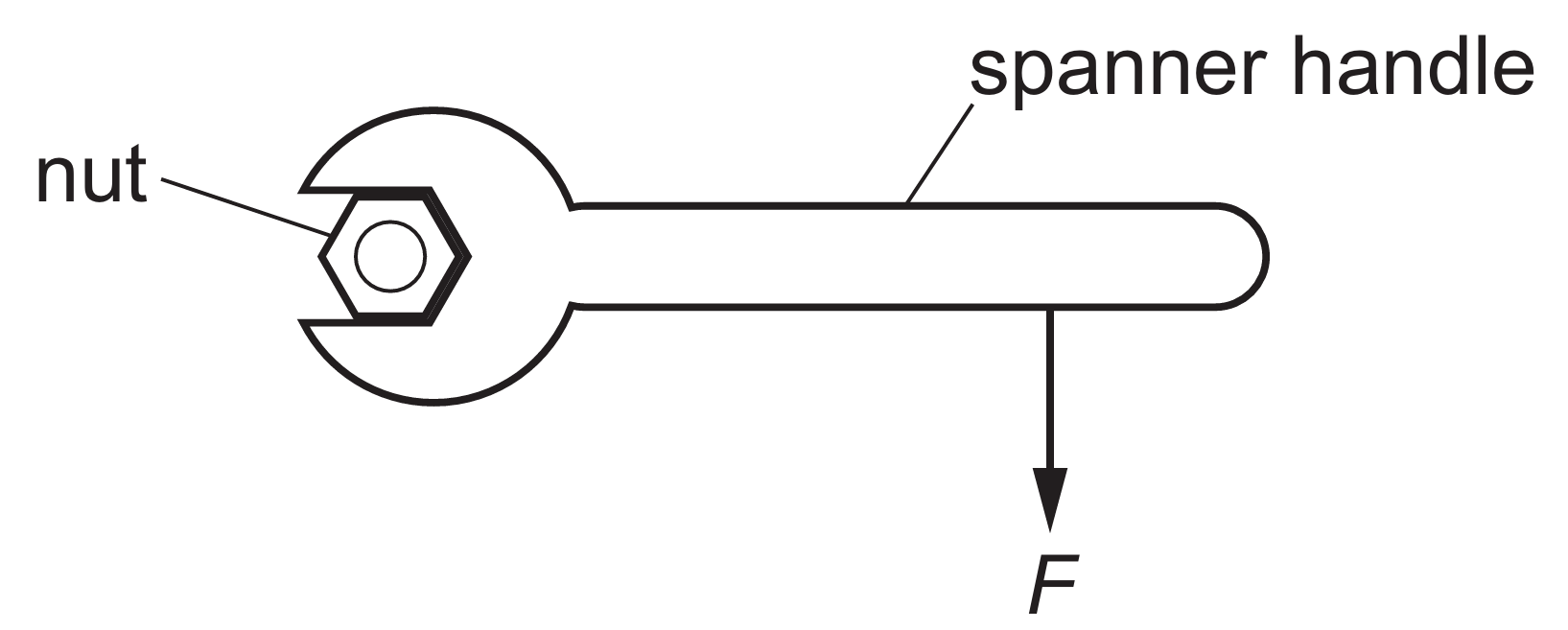 The moment of a force is defined by the equation $M = F \times d$, where $d$ is the perpendicular distance from the pivot (the nut) to the line of action of the force.