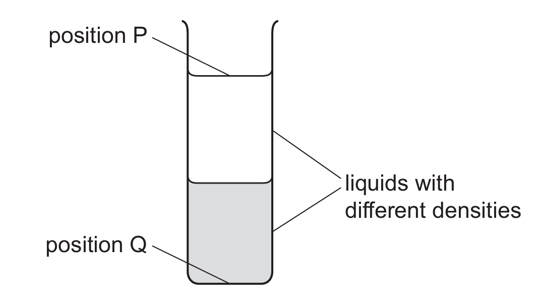 Graph B correctly shows the pressure starting at $0$ at position P, increasing steadily, and then adopting a steeper positive slope in the denser bottom liquid.