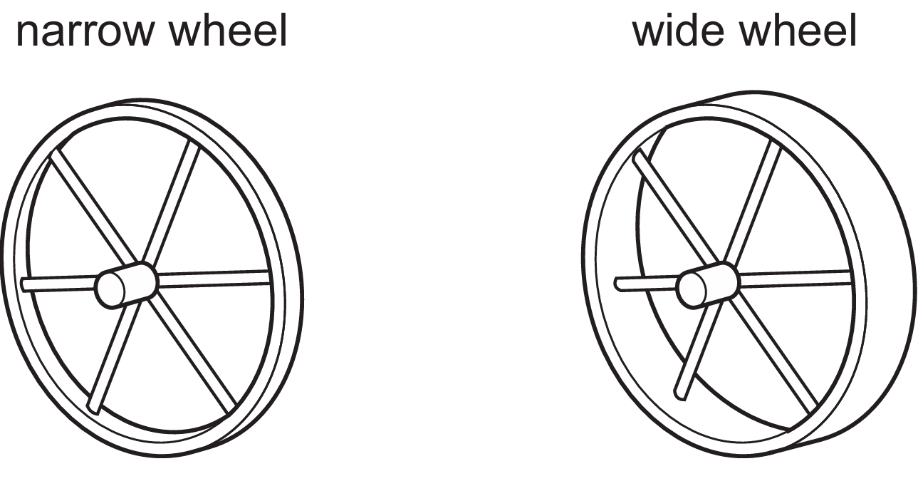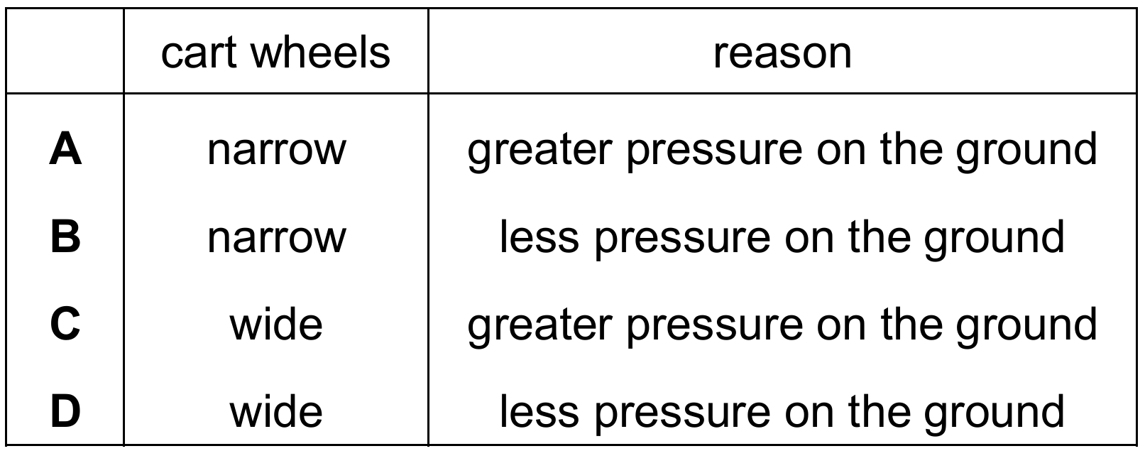 Pressure is defined as the force applied per unit area, expressed by the formula $p = \frac{F}{A}$. Since both carts have the same weight, the downward force $F$ exerted on the ground is constant for both. The wide wheels have a larger surface area $A$ in contact with the soft ground compared to the narrow wheels. According to the relationship $p \propto \frac{1}{A}$, a larger contact area results in a lower pressure $p$ exerted on the surface. Because the wide wheels exert less pressure, they are less likely to compress the soil, meaning they sink less into the ground. Therefore, Row D correctly identifies the wide wheels and the reason as less pressure.