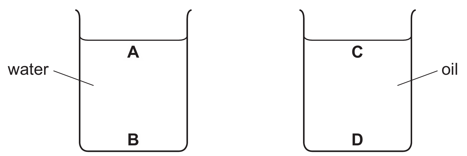 Pressure increases with depth, so positions B and D at the bottom of the beakers will have higher pressure than A and C.