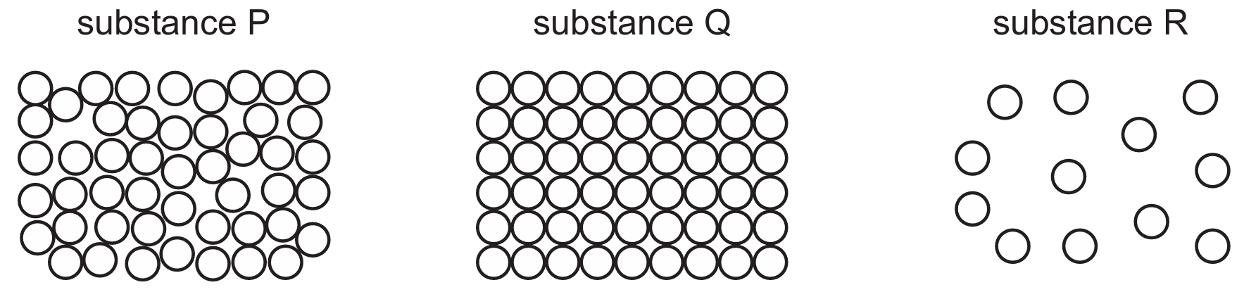Based on the particle diagrams, substance $Q$ is a solid (regularly arranged), $P$ is a liquid (randomly arranged but touching), and $R$ is a gas (widely spaced).