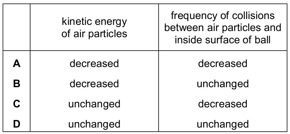 This leads to a decrease in the frequency of collisions between the air particles and the inside surface of the ball.