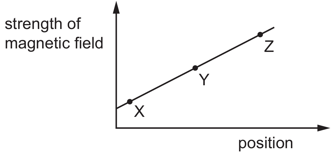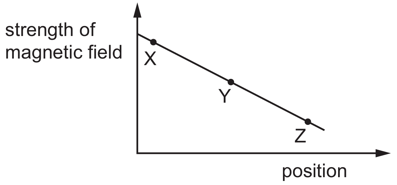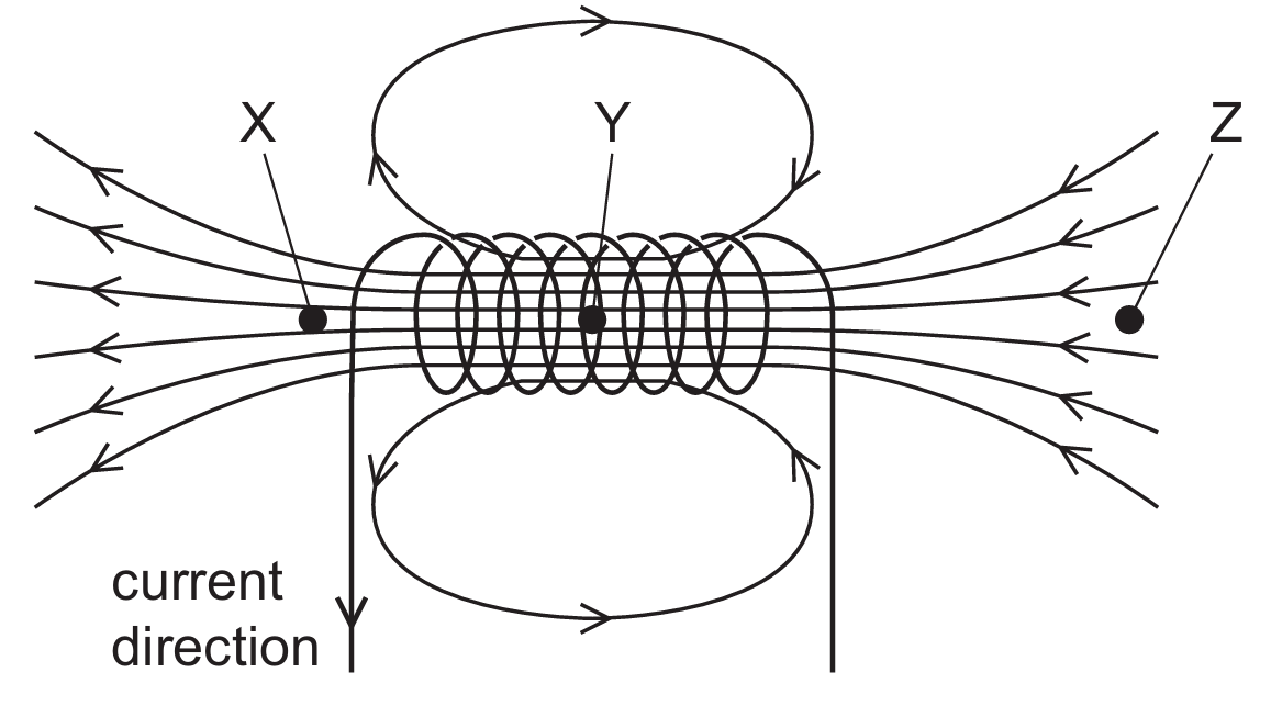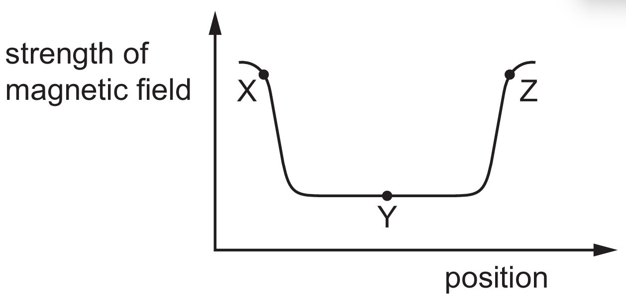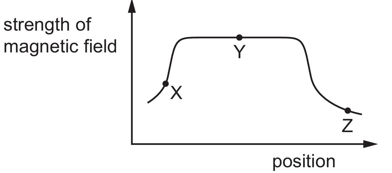 The strength of a magnetic field is indicated by the density or spacing of the magnetic field lines. Inside the solenoid at position $Y$, the field lines are straight, parallel, and very close together, representing a strong and uniform magnetic field. As we move to positions $X$ and $Z$ at the ends of the solenoid, the field lines begin to diverge and spread out into the surrounding space. This increased spacing indicates that the magnetic field strength decreases significantly outside the coils compared to the center. Graph $C$ correctly illustrates this by showing a high, flat peak at $Y$ and lower values at $X$ and $Z$.