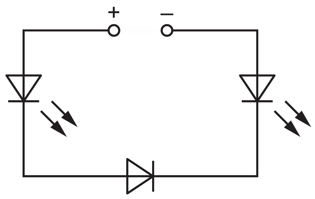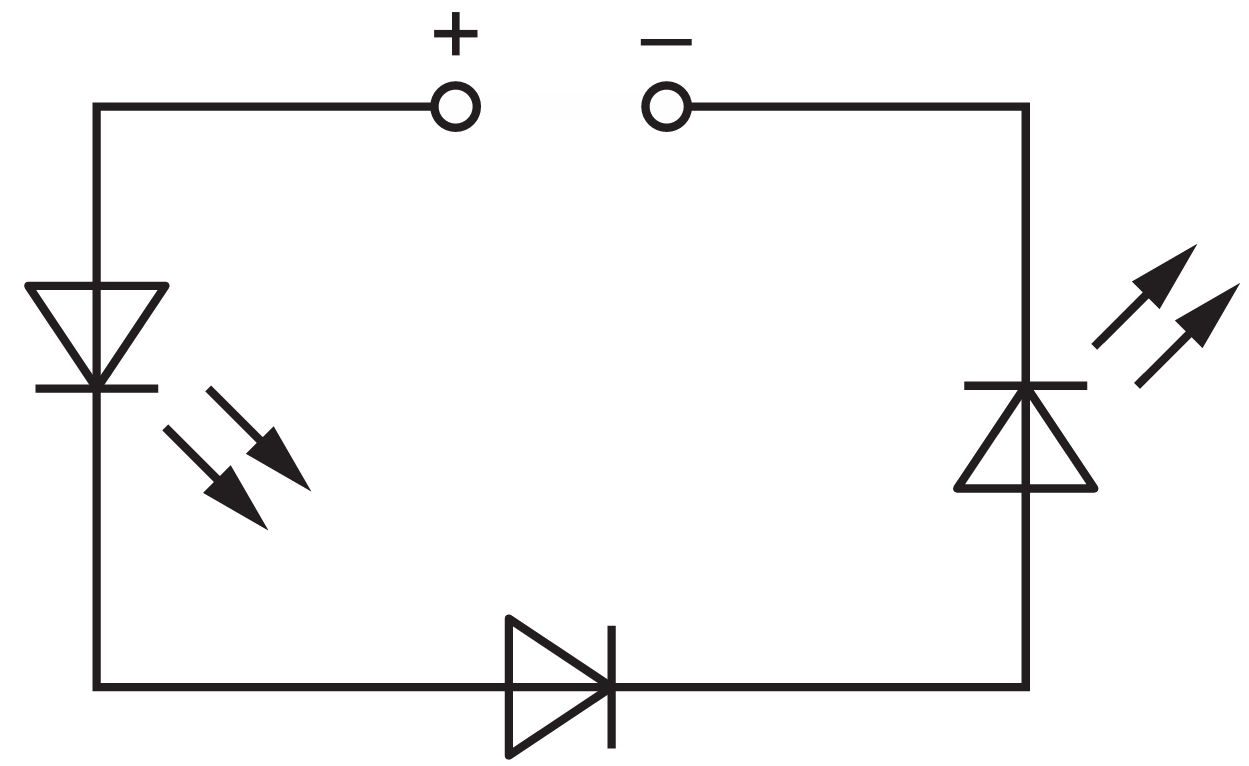 Since all three components are forward-biased, the circuit is complete and both LEDs will illuminate.