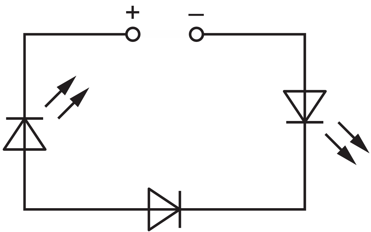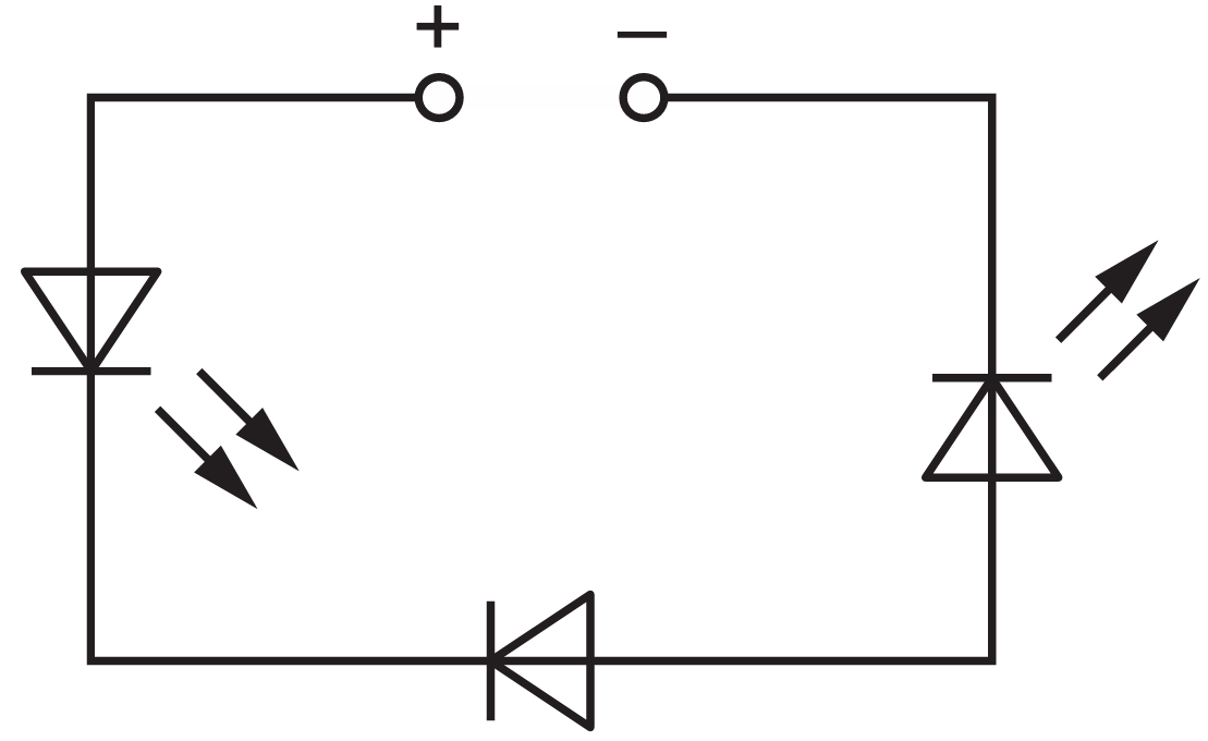 For an LED or diode to conduct, it must be forward-biased, meaning conventional current must flow in the direction of the triangle symbol ($+$ to $-$).
