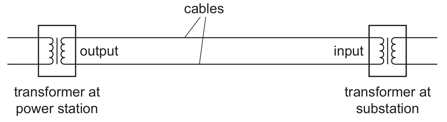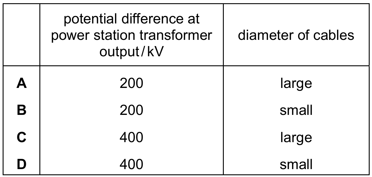 To deliver maximum power, we must minimize power loss ($P_{loss} = I^{2}R$) in the cables. Using a higher potential difference ($V = 400 \text{ kV}$) reduces the current ($I$) since $P = IV$. Lower current significantly reduces $I^{2}R$ losses. Additionally, resistance ($R$) is inversely proportional to cross-sectional area; thus, cables with a large diameter have lower resistance. Combining the highest voltage ($400 \text{ kV}$) and the lowest resistance (large diameter) ensures the least energy is wasted as heat, delivering the most power to the substation.