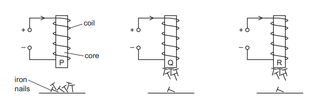 Three cores of different metals P, Q and R are placed inside identical coils of wire.