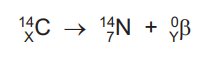 A radioactive isotope of carbon 14C decays by beta emission to give an isotope of nitrogen 14N and a beta particle. The equation for the reaction is shown.